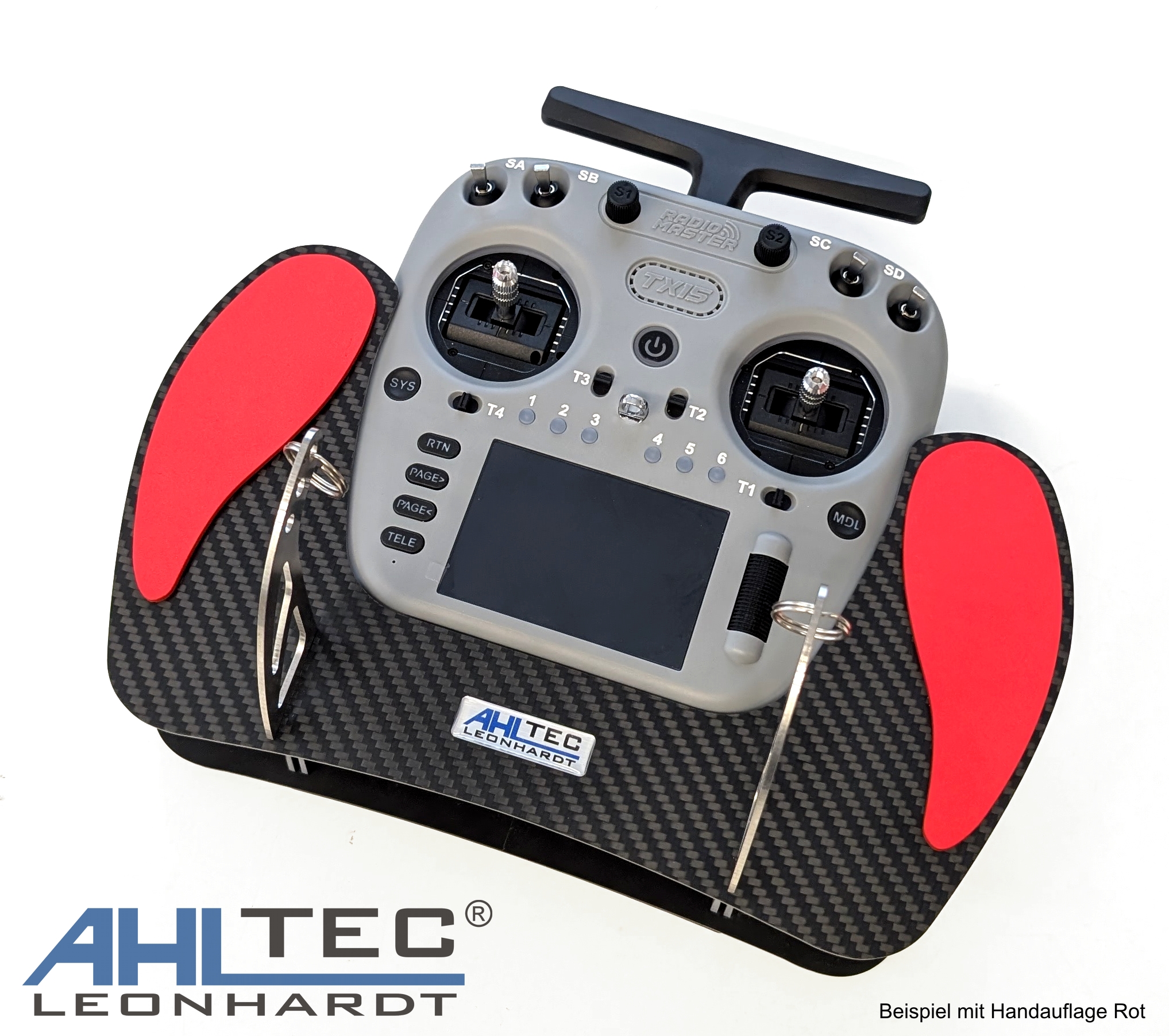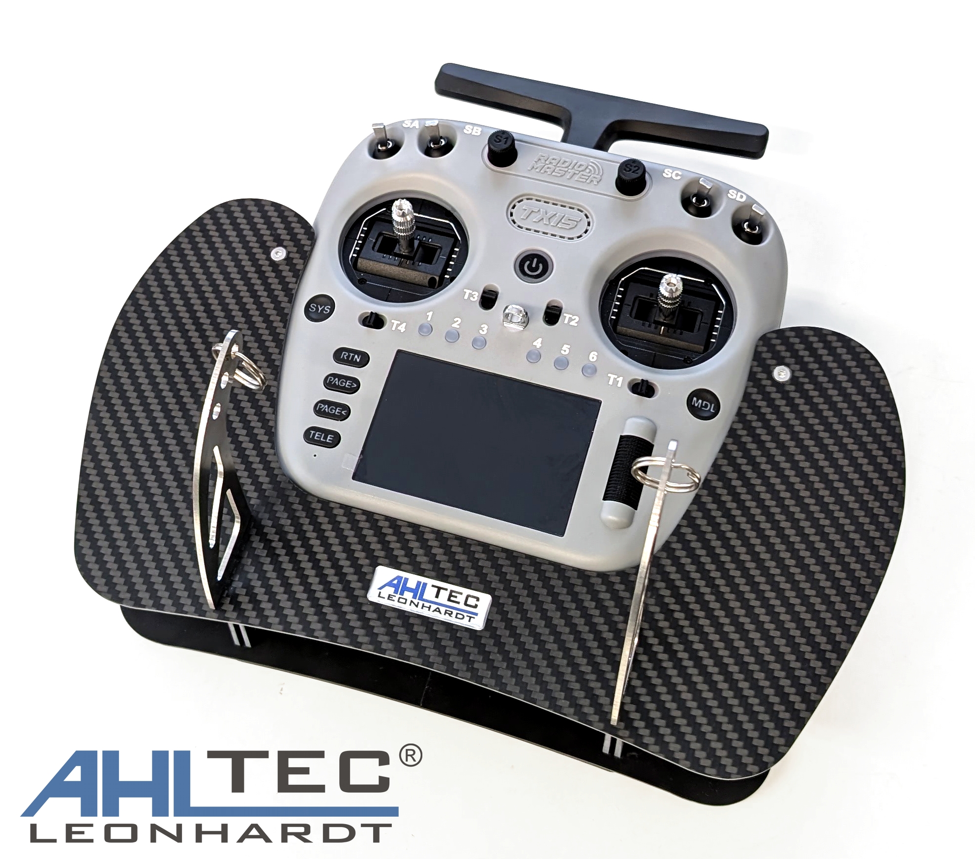 Alternativ bieten wir ihnen klappbare Senderpultbügel, welche im geklappten Zustand die Höhe des Senderpultes um 5 cm verringern.
