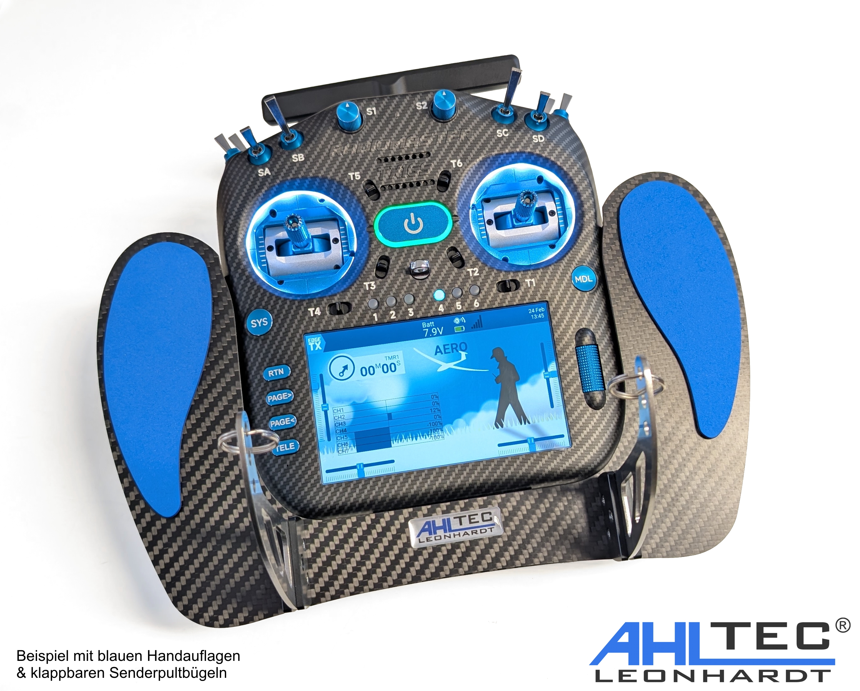 Alternativ bieten wir ihnen klappbare Senderpultbügel, welche im geklappten Zustand die Höhe des Senderpultes um 5 cm verringern.