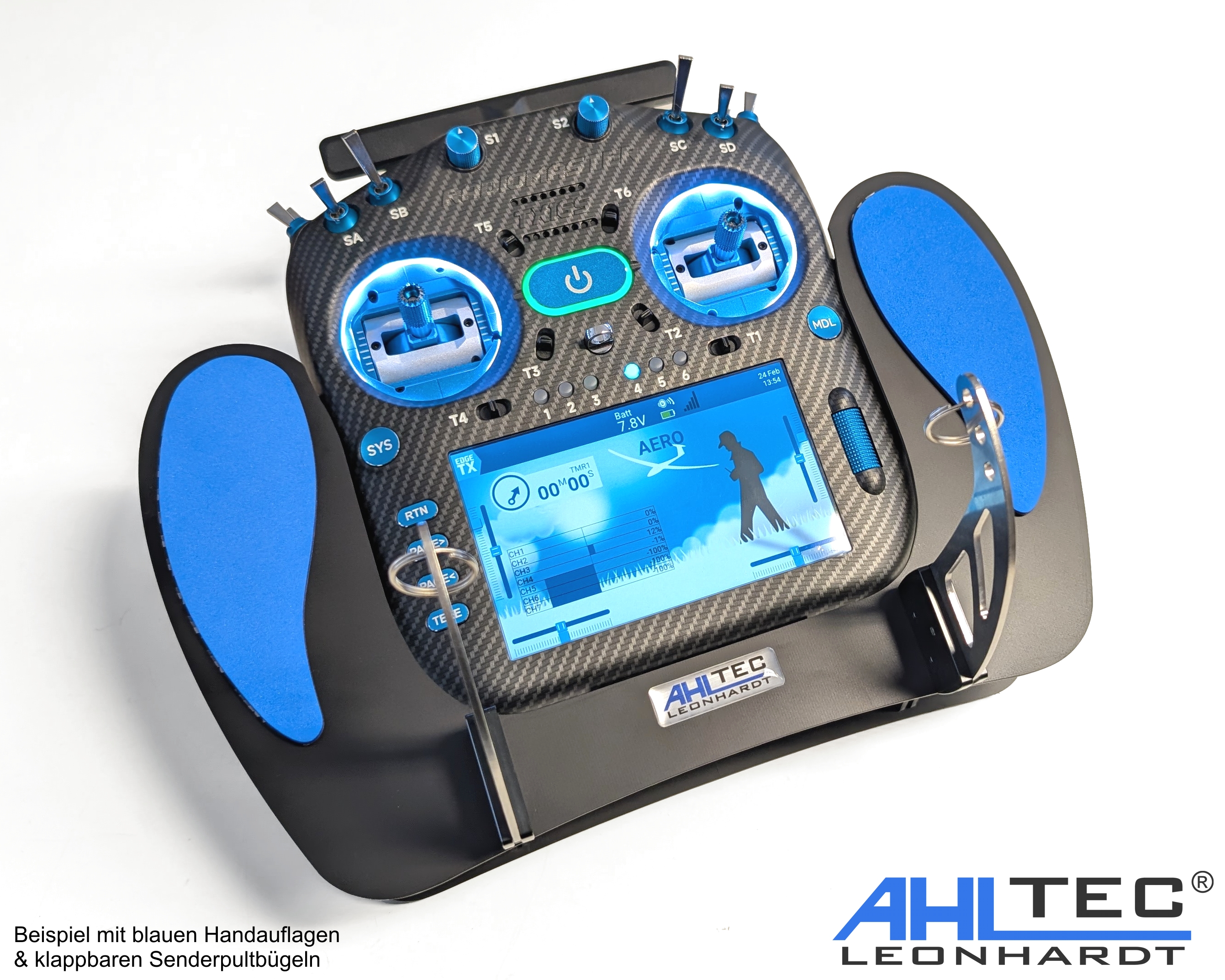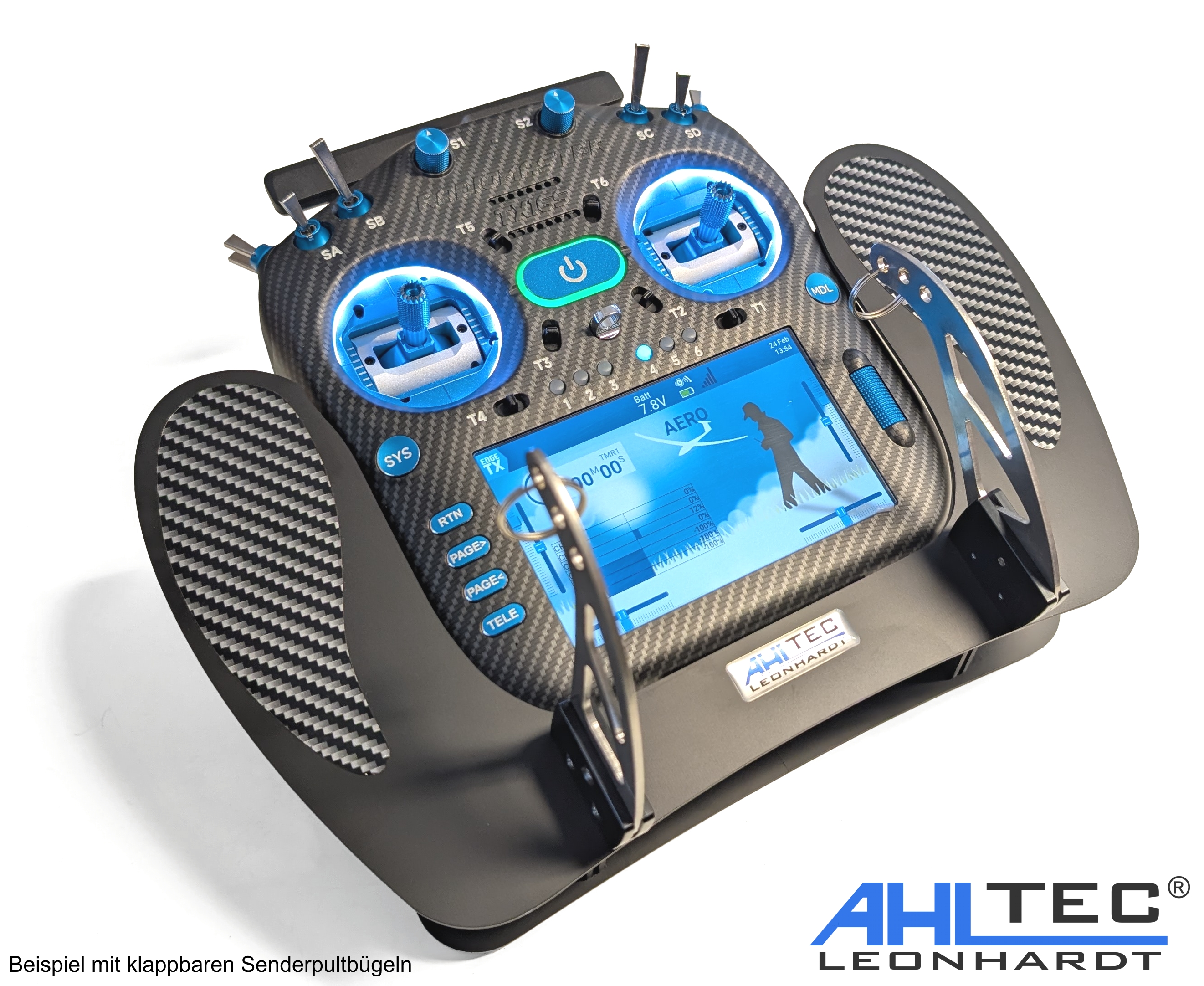 Alternativ bieten wir ihnen klappbare Senderpultbügel, welche im geklappten Zustand die Höhe des Senderpultes um 5 cm verringern.